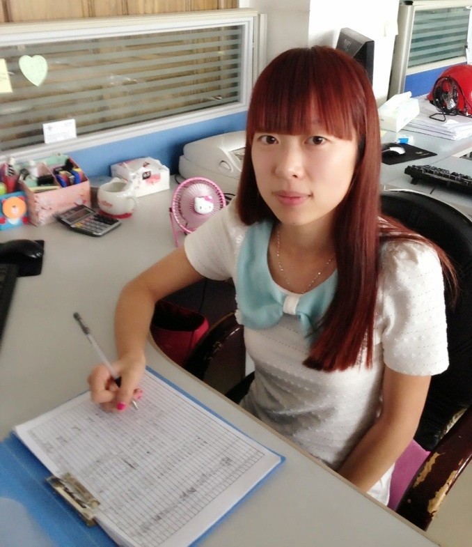 陆微,现工作于江苏无锡普天铁心有限公司从事文员工作,负责图纸发放整理,各类数据资料统计工作(该生正在统计技术部人员考勤的工作照片)。工作中,以耐心细致要求自己,因为一环出错,步步出错。勤恳的态度受到领导和同事的肯定。