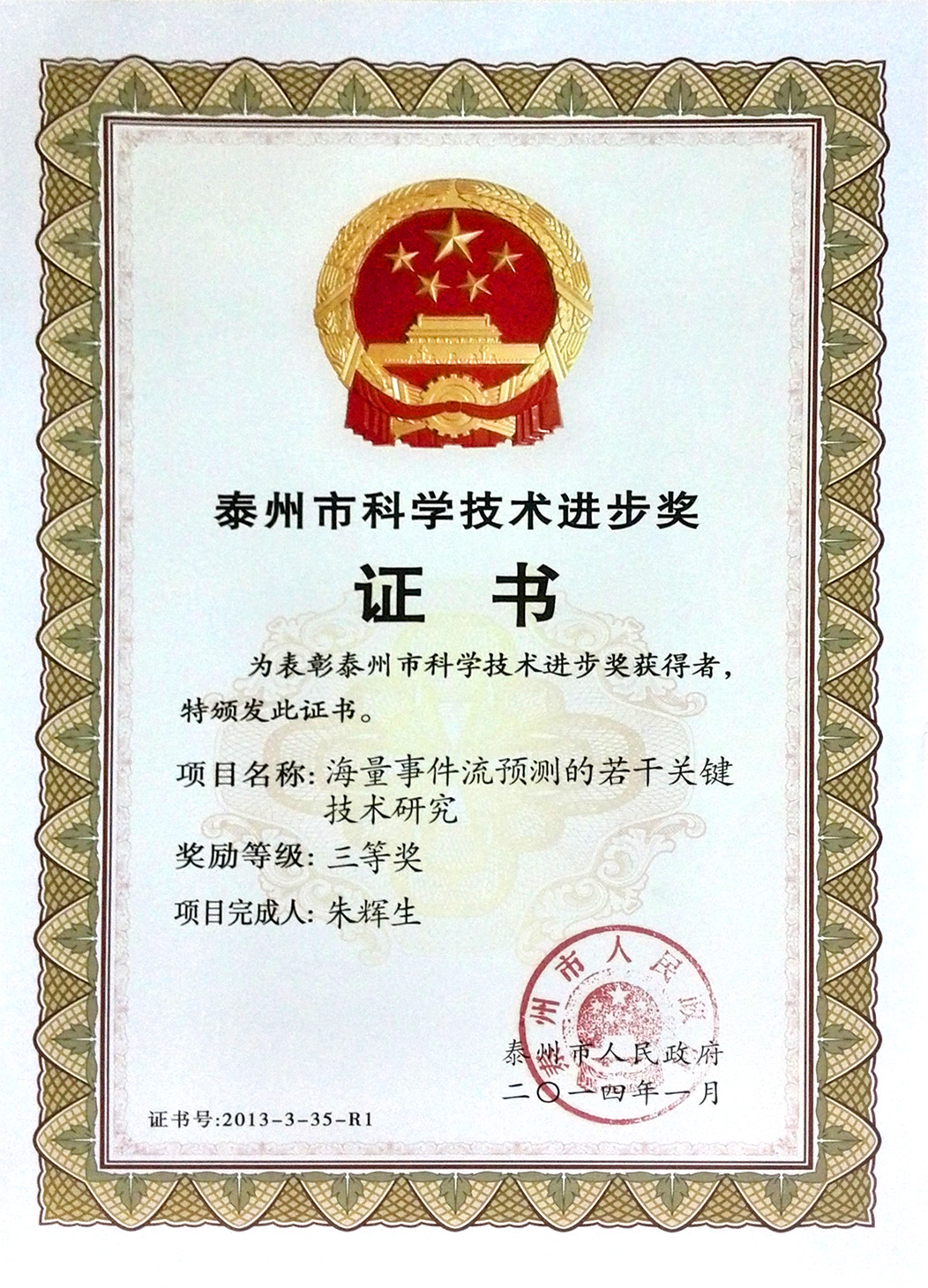 近期,该院朱辉生博士主持的《事件流的趋势预测研究》科技项目被泰州市科技局推荐申报2014年度江苏省科技进步奖,《事件流模式挖掘的关键技术研究》成功申报江苏省自然科学基金面上项目。(计科院)