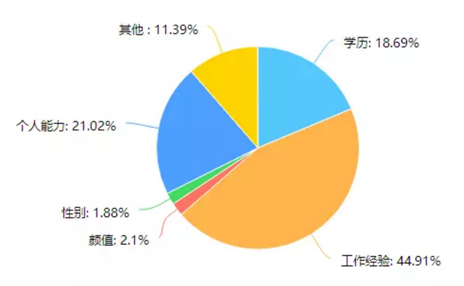 2017年应届生在就业难度感知方面,表示“有点难,但可以接受”的比例占到49.3%,认为“很难,要费很大功夫”的比例占到32.4%,表示“很轻松”、“不难”的比例合计占到12.8%。而在影响应届生签约的因素中,工作经验以44.9%排在首位,紧随其后的是个人能力和学历,同时与实践能力直接挂钩的工作经验也被用人单位作为选择人才的首要因素。