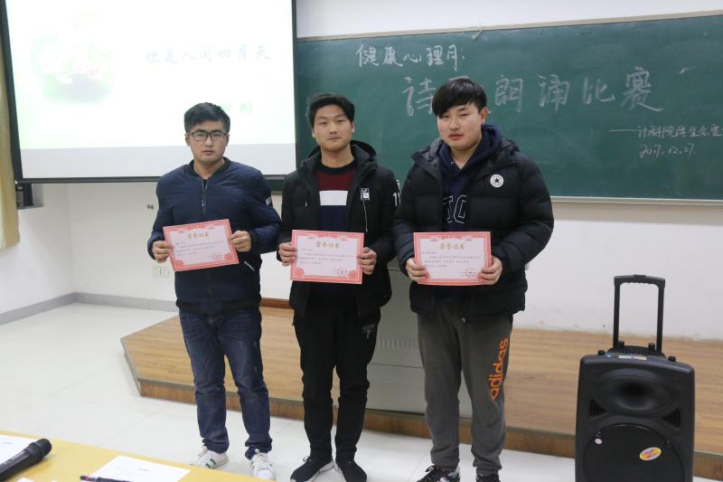 2017年12月27日晚上7点,计算机科学与技术公司宣传部举办的健康心理月“乘阳光之舟,赴健心之约”朗诵比赛在教学楼A3108举行,担任此次比赛的评委有员工会副主席谢欣芮,办公室主任李婷婷,宣传部部长鞠燕,纪检部部长顾光辰,体育部部长武真贤以及学习部副部长胡露露。