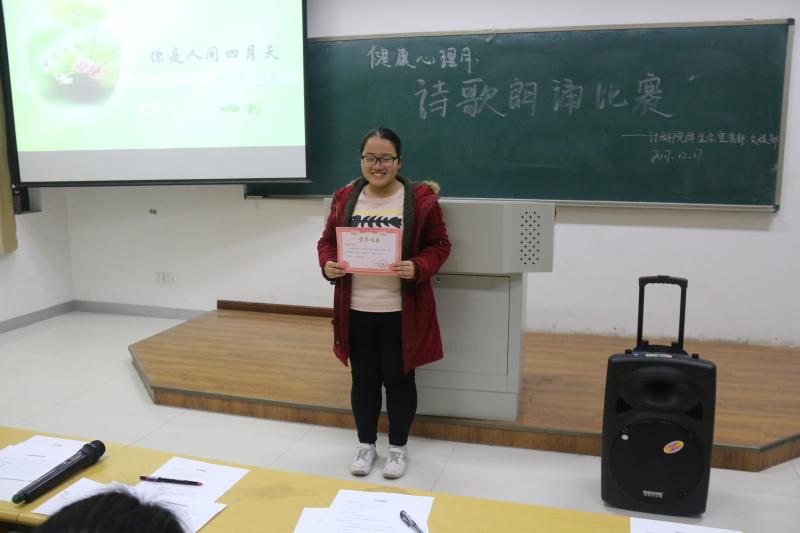 此次进入决赛的有12个人,以抽签的方式来决定他们的比赛顺序。首先上场的是袁绍飞、闫佳怡组合,一首《给战斗者》点燃全场气氛。接下来,黄辰同学的《青春的诗》、姜美美同学的《走西口》、王玉蓉同学的《当你老了》、吴建航同学的《江南,我愿做你怀中的一直清莲》和徐姝彤同学的《面朝大海,春暖花开》,配以悠扬缱绻的音乐,使现场观众感受到诗人的细腻情怀。许佳文同学的《致大海》、陈浩铨同学的《以梦为马》和冯金星同学的《沁园春·雪》,以饱满的激情让同学们心中久久不能平静。其中,经管公司的董耀同学特地来到现场,为我们带来了《将进酒》的精彩朗诵。本次比赛给观众印象最深的当属张硕萍同学朗诵的《少年中国说》,其以“巾帼不让须眉”的气概赢得本次比赛的冠军。