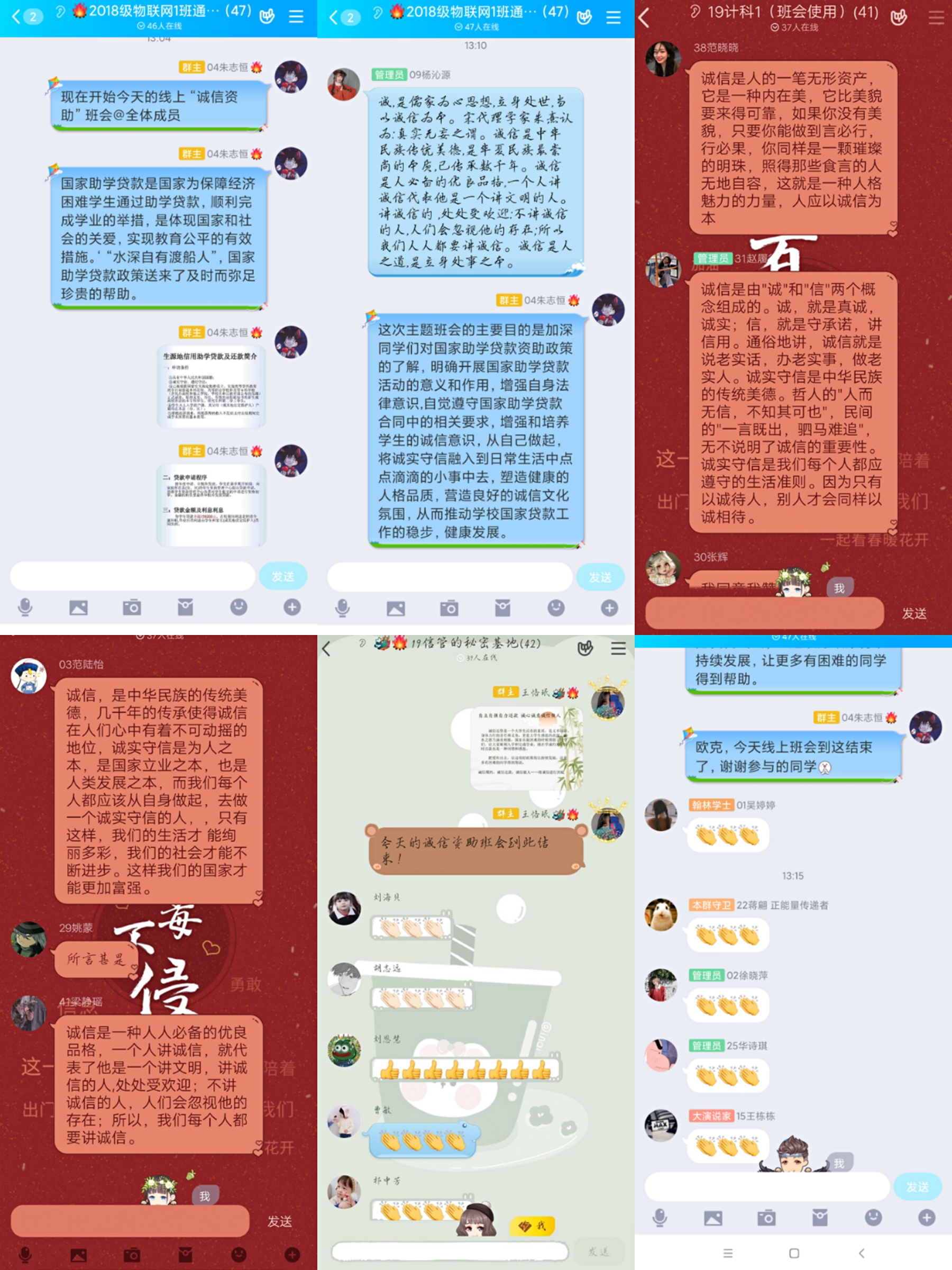 在活动过程中,各班班长或资助宣传员给同学们宣讲守信事迹,倡导契约精神,向同学们普及国家助学贷款及其他资助政策知识。一方面增进员工的诚信做人意识,另一方面增强了员工对国家资助政策的了解。一场场别开生面的班会,让同学们印象深刻,受益匪浅。同时,在班级群中引起热烈讨论。诚信并不一定体现在一诺千金的大事上,将诚信融入到学习和生活中的每一件小事中,让诚信变为一种自发的习惯行为,这才是最重要的。