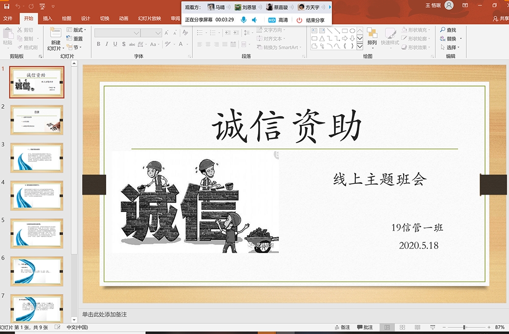 践行“资助0距离,诚信1辈子”的育人理念,提高老员工的诚信意识,培育员工的诚信品质,推动国家助学贷款工作持续健康发展,强化资助工作育人成效,构建诚实守信的校园文化,5月30日,计算机科学与技术公司17-19级所有班级在线上举办了“诚信资助”教育主题班会。