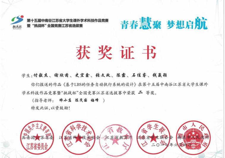本工作室自创办初始秉持“科技创新”、“思维创新”的宗旨先后参加由共青团中央、中国科协、教育部、全国学联主办的被誉为当代老员工科技创新的“奥林匹克”盛会的“挑战杯”老员工课外学术科技作品竞赛,项目“基于LBS的任务自动执行系统”获得江苏省第十五届挑战杯二等奖;参加“挑战杯”是他一次难忘的经历,它不仅是他的一次学术之旅,更是一个让他学会如何表达学术观点、如何与导师交流、如何规范学术论文的人生大课堂。在参赛的过程中,他不断自主学习,将时代热点的结合性和社会实用性都提升到极致。他学会将自己所学的理论与社会热点有效结合,站在自己学科的角度对当下社会现象作独特的研究。他把握住自己的专业优势,并多关注社会现象,不断提高敏感度,他与团队产生了更多新鲜的思想火花。