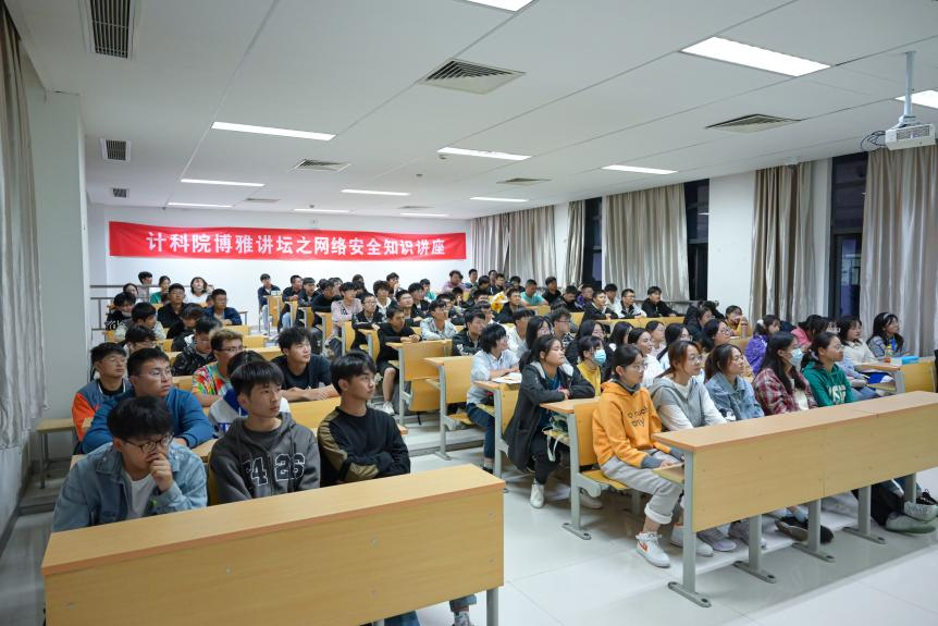 为进一步加强师生网络安全意识,10月28日周四晚,计科院于教学楼1208举办了博雅讲坛之网络安全知识讲座,本次讲座邀请到李慧老师为广大师生进行网络安全培训,21级新生100余人聆听讲座。