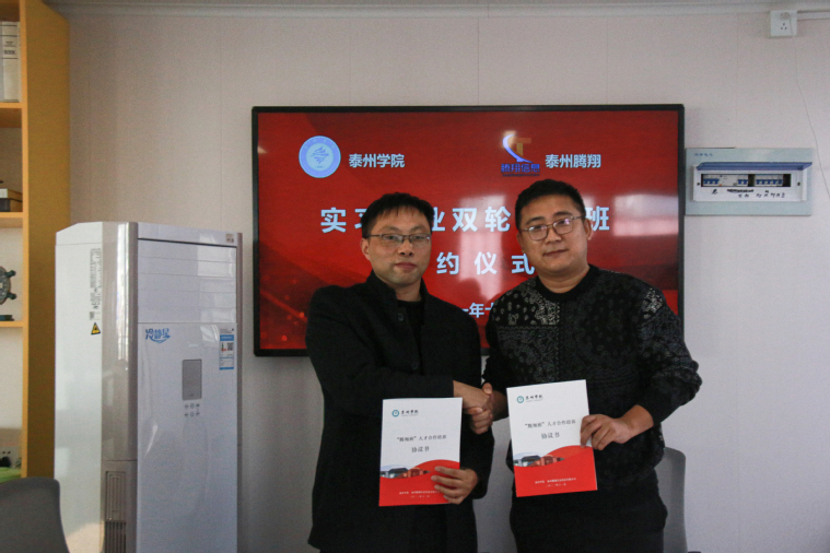 泰州腾翔信息科技有限公司刘俊飞总经理向大家介绍了公司概况,校方介绍了公司及公司情况,双方就实习就业、课程嵌入等方面的合作进行了深入探讨。刘俊飞和教务处副处长彭海静共同签署了“腾翔班”人才合作培养协议书。