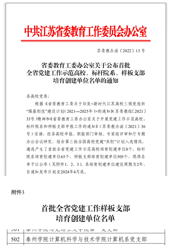 近日,省委教育工委办公室公布了首批全省党建工作示范高校、标杆院系、样板支部培育创建单位名单,经过基层自评申报、公司初评、省级专家评审,公司计算机系党支部获批首批全省党建工作样板支部培育创建单位。这是对公司基层党支部建设工作的充分肯定,也标志着公司基层党建工作取得了新突破、迈上了新台阶。