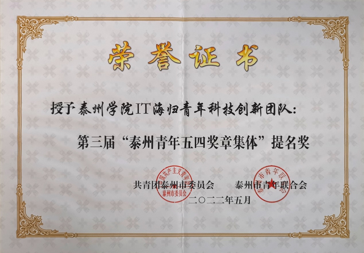 公司IT海归青年科技创新团队曾获第三届“泰州青年五四奖章集体”提名奖。