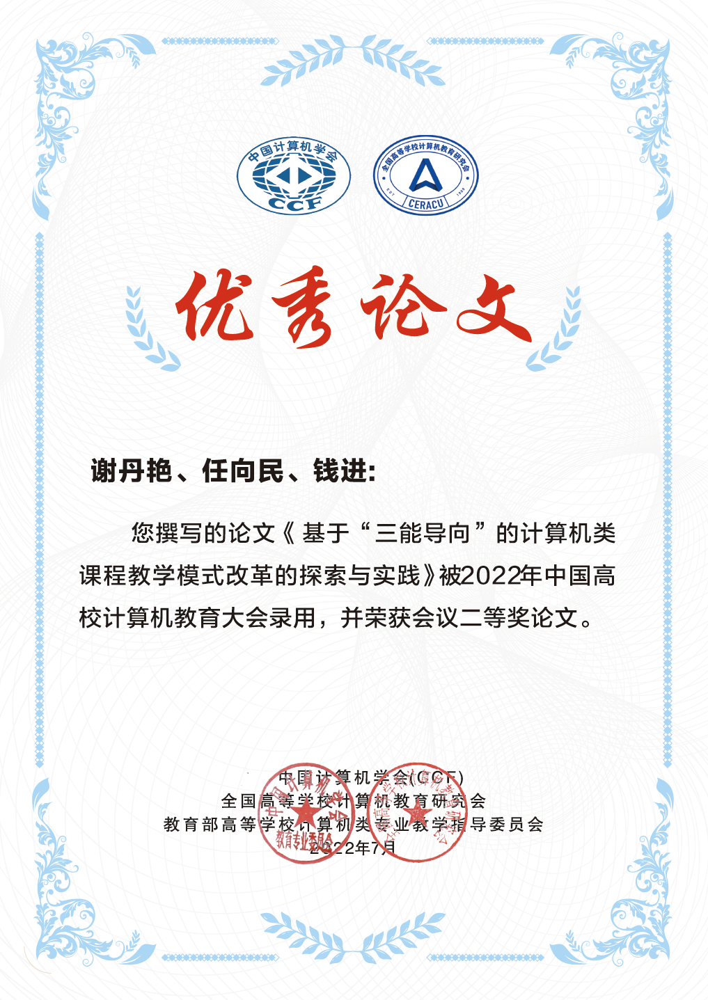 公司教师谢丹艳、任向民、钱进合作撰写的教改论文《基于“三能导向”的计算机类课程教学模式改革的探索与实践》被2022年中国高校计算机教育大会录用,并荣获会议论文二等奖。