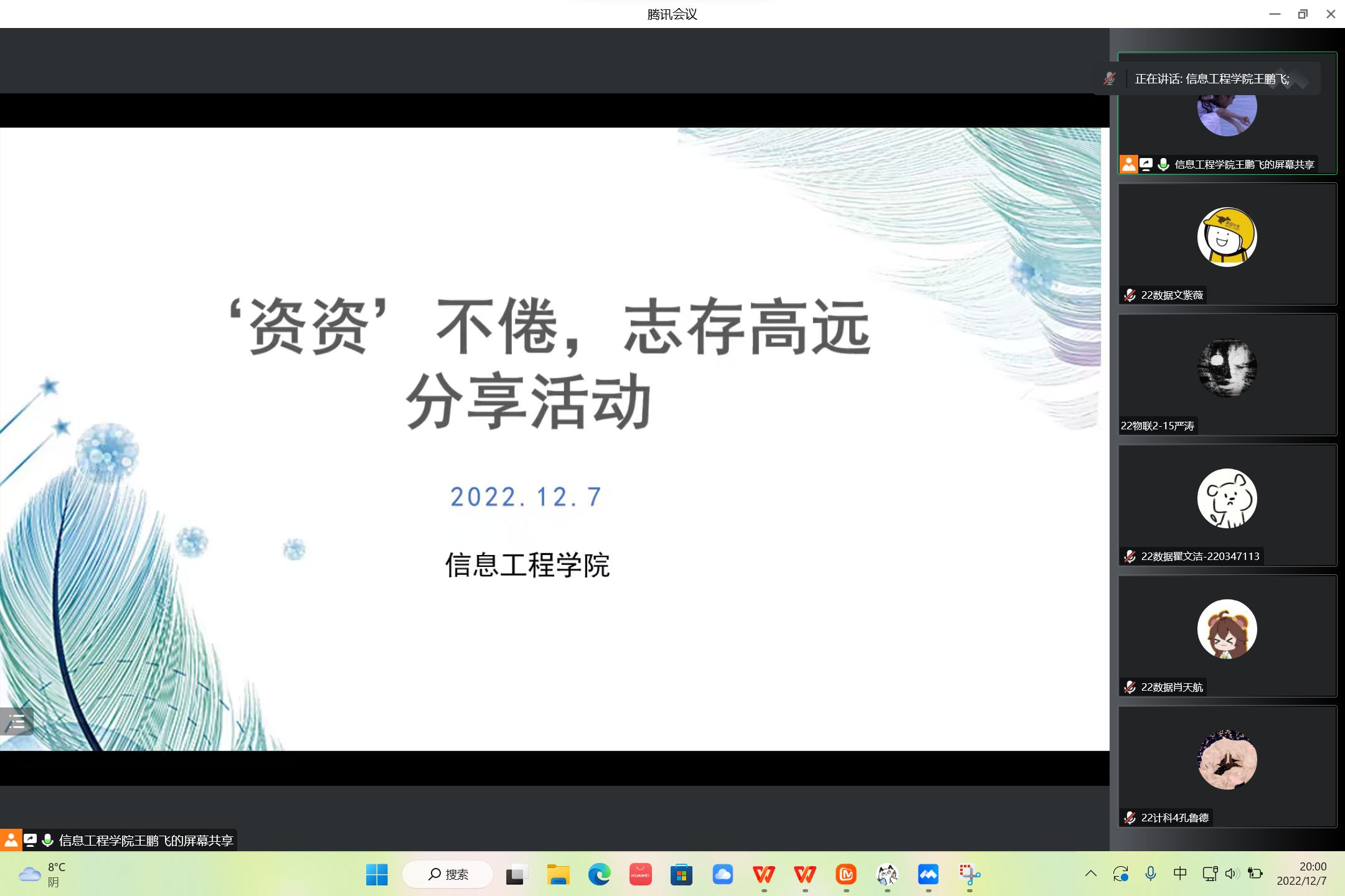 12月7日晚上20时,公司开展了“‘资资不倦’,志存高远”指导讲座。本次讲座邀请了徐晓萍,谈润陆和袁泽三位优秀毕业生通过分享自己的大学经历和考研、考公的一些心得来为其他年级的同学们提供宝贵的经验和意见。