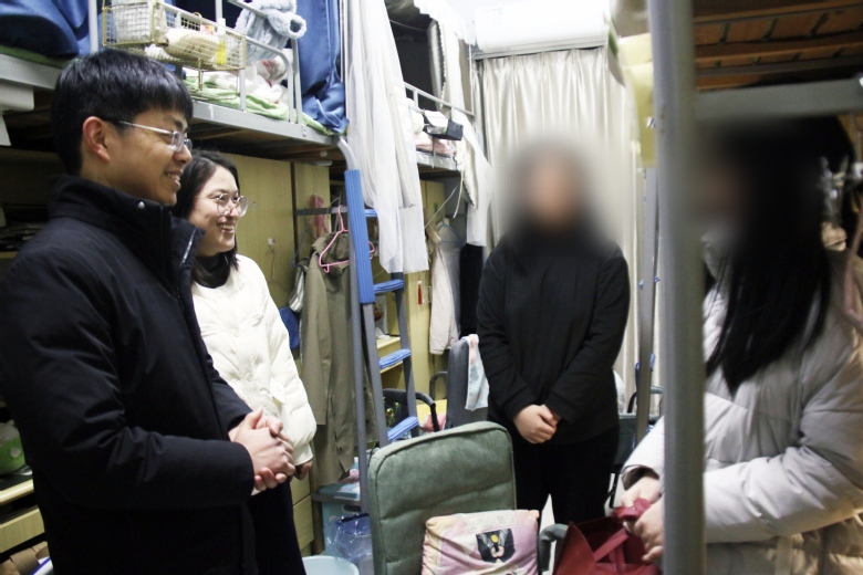 老师们走进员工宿舍,为同学们送上亲切关怀和暖心慰问品,同时就学习、生活、人际交流等方面与同学们暖心交流,询问同学们的寒假计划,关心关爱同学们的安全。朱诚鼓励同学们要自信自强,认真复习和备考,争取取得优异的成绩。他希望同学们要积极发扬不怕吃苦、敢于奋斗的精神,不断丰富和提升个人综合素质,争取早日实现个人的理想和价值。