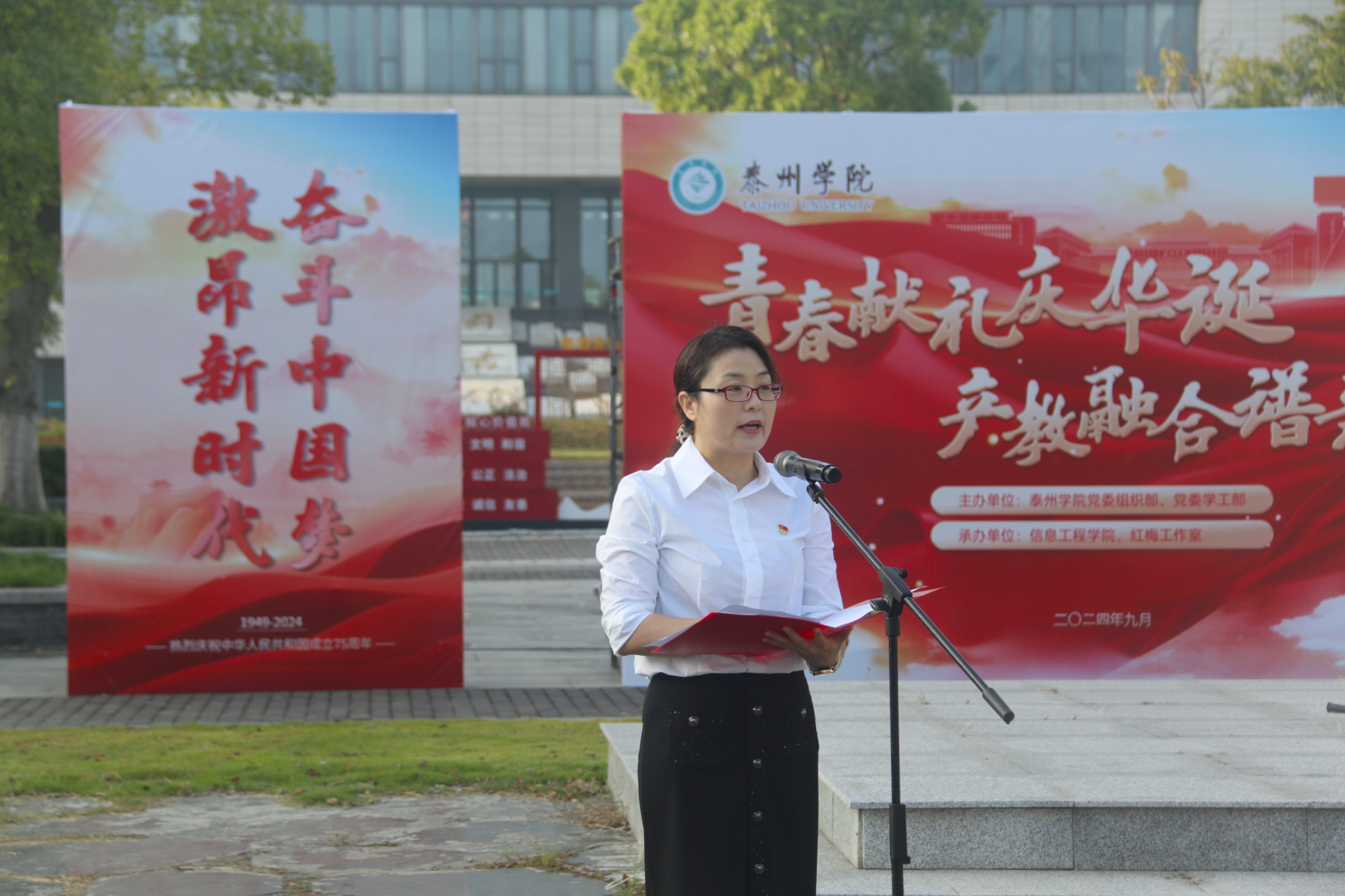 活动分为三个阶段。第一阶段,在胡瑗广场隆重举行庆祝中华人民共和国成立75周年升国旗仪式。伴随着雄壮有力的《义勇军进行曲》,鲜艳的五星红旗冉冉升起。国旗下,全体人员庄严肃立,齐声高唱国歌,深情祝福伟大祖国繁荣昌盛。师生代表激情朗诵的诗歌《我是党员奋斗有我》,将全场振奋人心的氛围推向高潮。信息工程公司党总支书记杨智红领学了党的二十届三中全会精神,并圈出关于教育、科技、人才论述的部分内容。教师代表、企业代表及员工代表依次发表学习心得,纷纷畅谈助力教育科技人才协同融合发展的决心和举措,为奋力实现中国式现代化、发展新质生产力挺膺担当。第一阶段活动在一曲由全场师生倾情演绎《歌唱祖国》的嘹亮歌声中圆满结束。