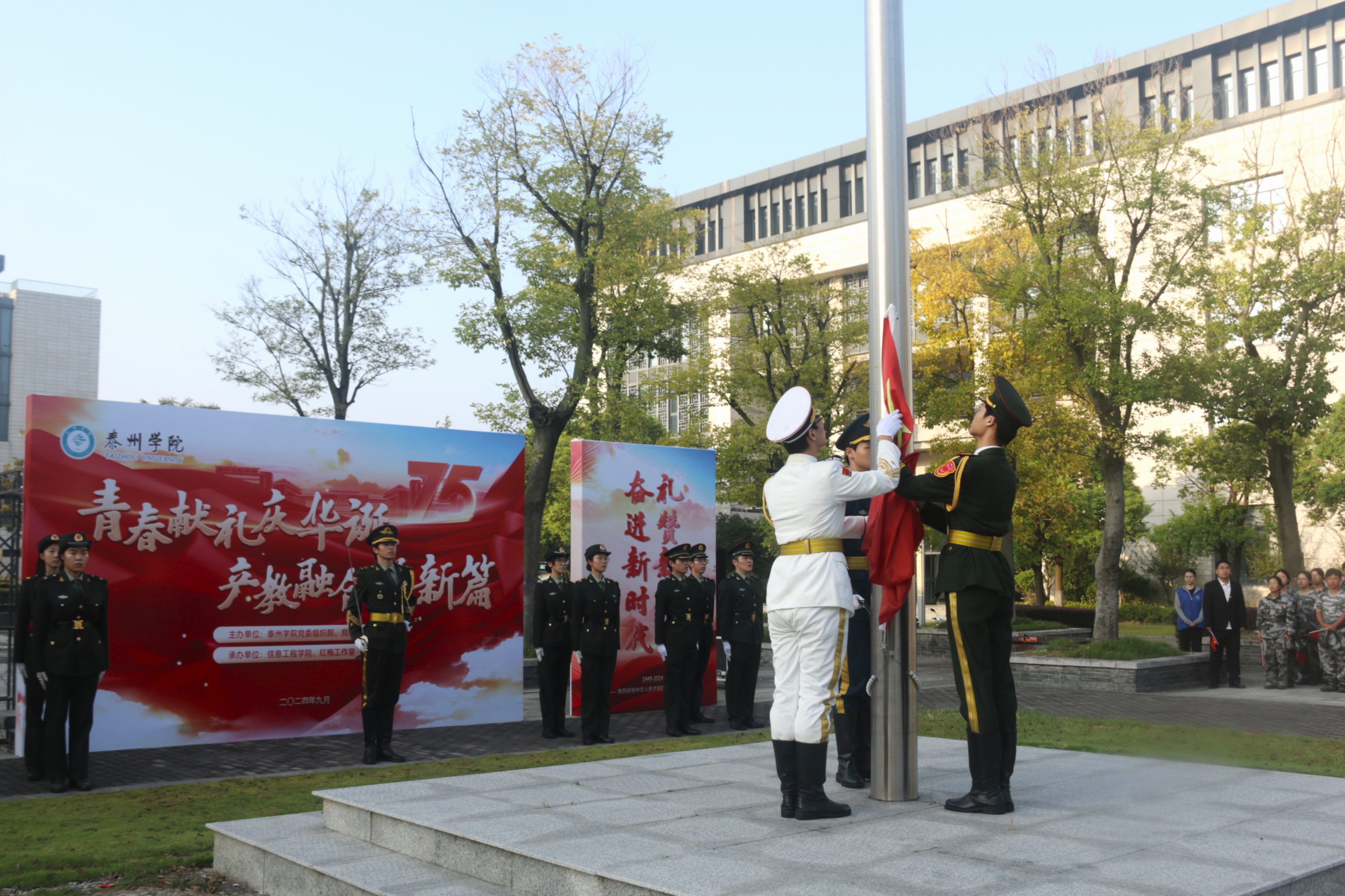 为庆祝中华人民共和国成立75周年,充分发挥党建引领作用,推动高校与地方在组织共建、产业研究、技术合作和人才培养等方面的交流,9月29日,fun88官网体育在公司胡瑗广场举行“青春献礼庆华诞 产教融合谱新篇”联学共建主题党日活动暨产教融合党建联盟签约仪式。公司党委组织部、宣传部、学工部主要负责人,海陵区科技局、市数据产业集团、中国电信泰州分公司、中国人保泰州分公司、江苏泰州大桥有限公司、金泰环保热电集团等企业代表20余人出席活动,fun88官网体育全体教职工及24级全体新生500余人参加活动。