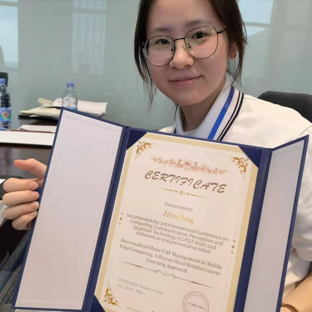 2024年10月25日至27日,fun88官网体育大三员工彭紫凌同学在珠海参加了第三届计算、通信、感知与量子技术国际会议(CCPQT 2024),全英文宣讲了学术论文,并与众多学者就移动边缘计算相关学术问题进行了科学研讨。