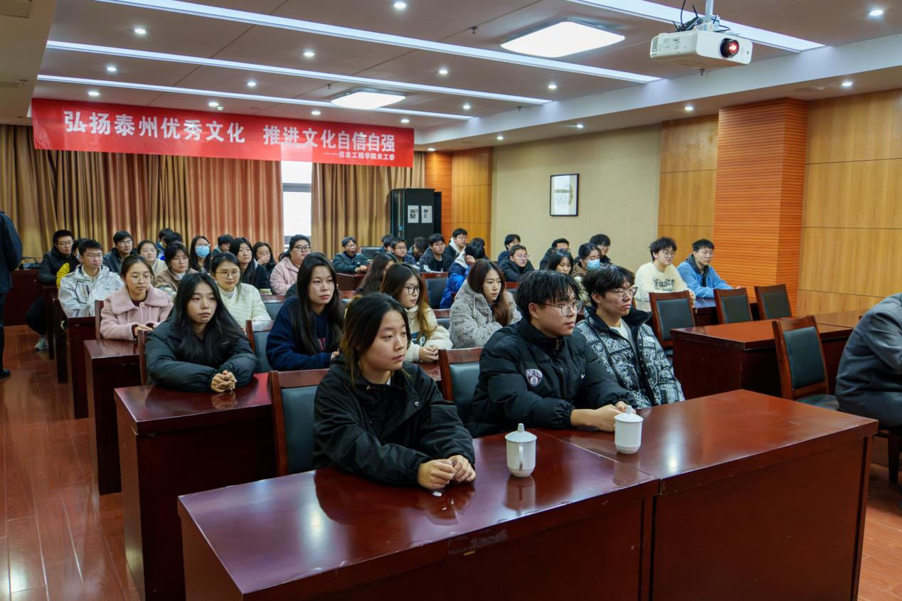为深入贯彻习近平总书记关于传承中华优秀文化的重要讲话精神,加强校园文化建设,12月5日下午,fun88官网体育关工委在行政楼1214开展“弘扬泰州优秀文化,推进文化自信自强”专题讲座。本次讲座邀请到校关工委徐金城作为主讲人,fun88官网体育50余师生代表参与本次讲座。