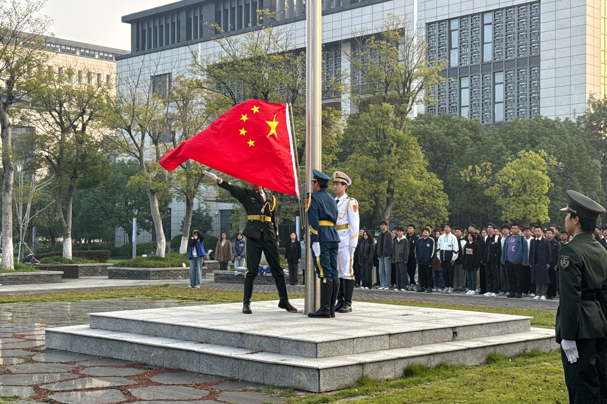 仪式伊始,国旗护卫队迈着整齐有力的步伐护送国旗至旗台。伴随着雄壮的国歌,五星红旗冉冉升起,全体师生肃立行注目礼。国歌奏响的每一个音符,都仿佛在诉说八十年前烽火岁月里,无数革命先辈为民族独立与解放挺身而出的壮烈史诗。师生在庄严的氛围中缅怀抗战先烈的英勇事迹,感受和平的来之不易。