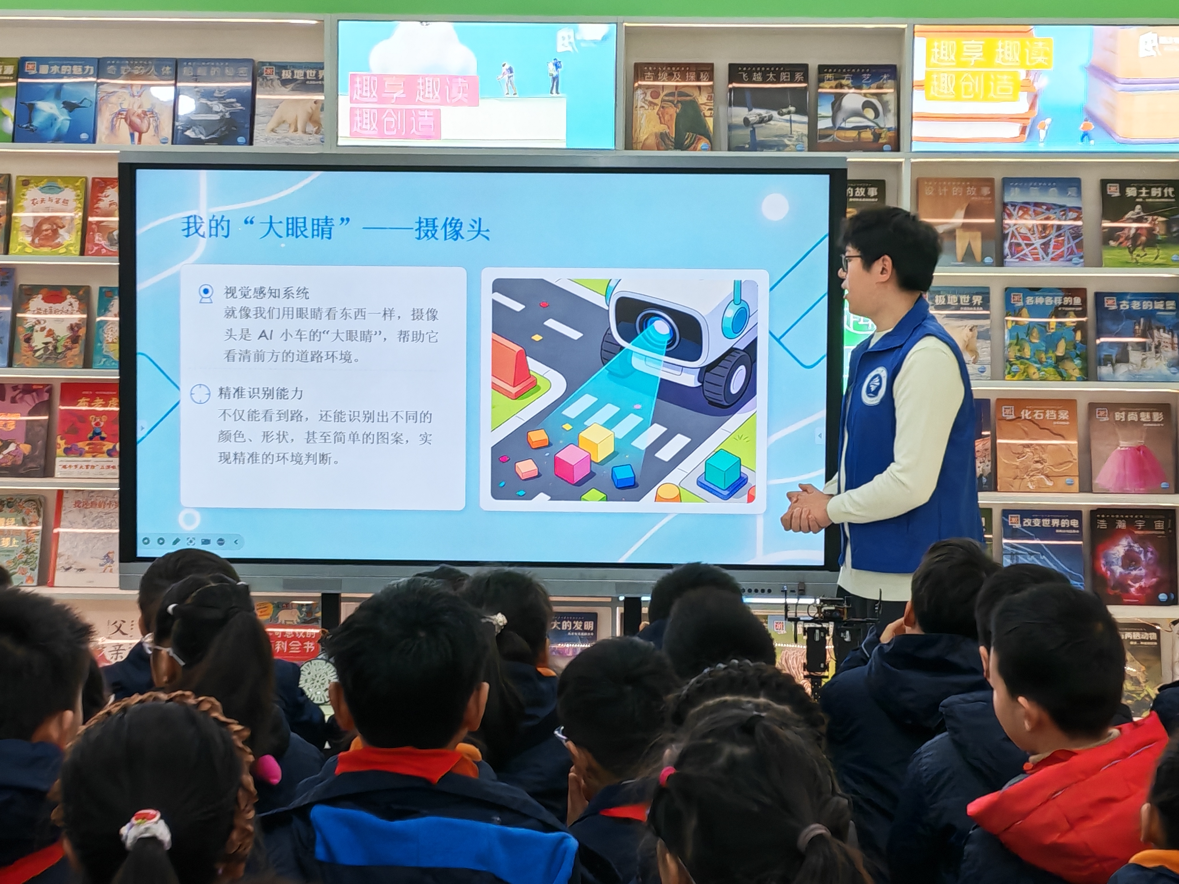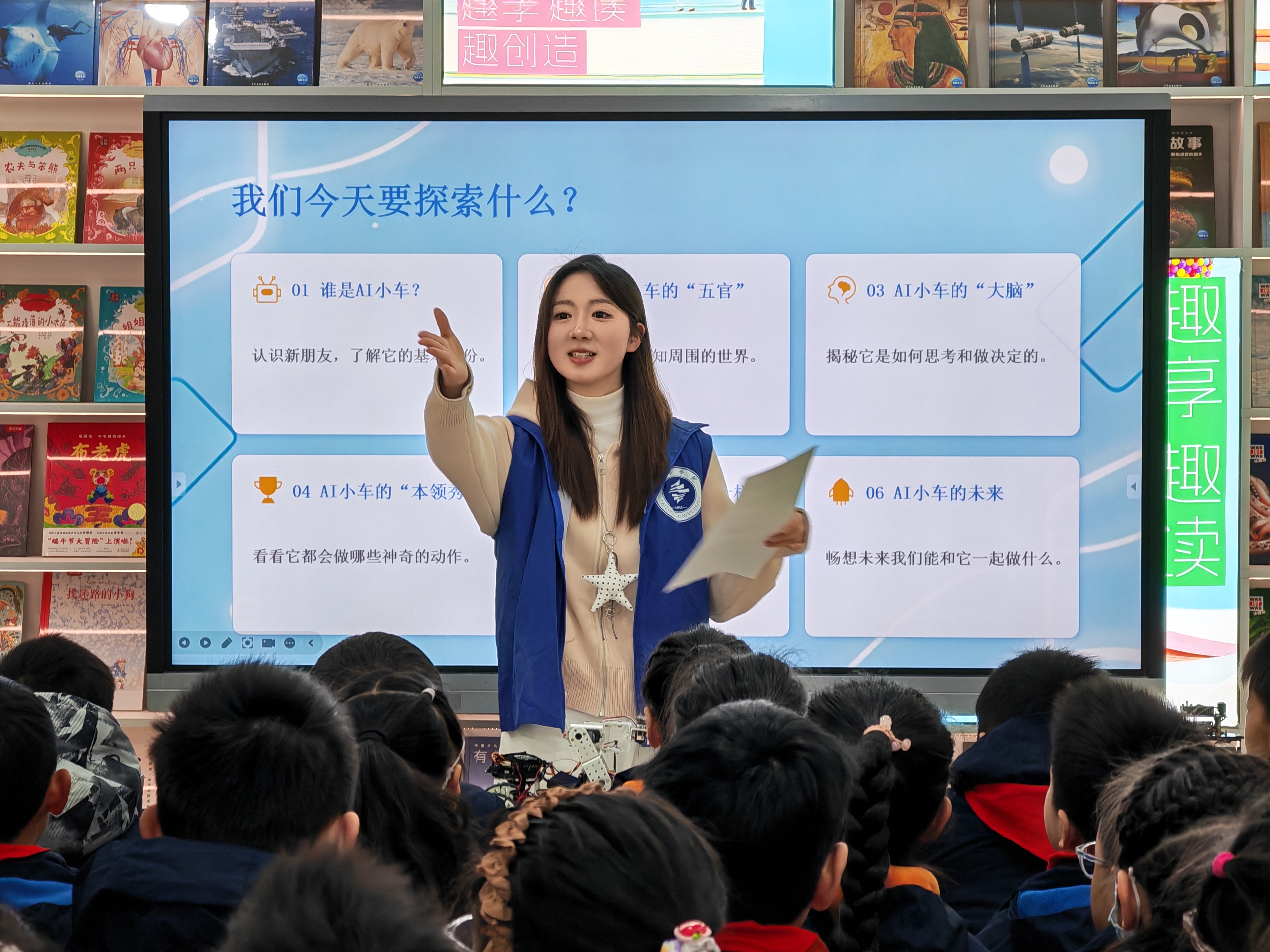 随后,志愿者王宗纬借助精心制作的PPT,用通俗易懂的语言和生动的动画,为孩子们讲解了智能小车的构造、传感器原理以及简单的编程逻辑。“小车为什么能自己走路?”“它的‘眼睛’在哪里?”面对孩子们的踊跃提问,王宗纬一一耐心解答,课堂气氛活跃热烈。