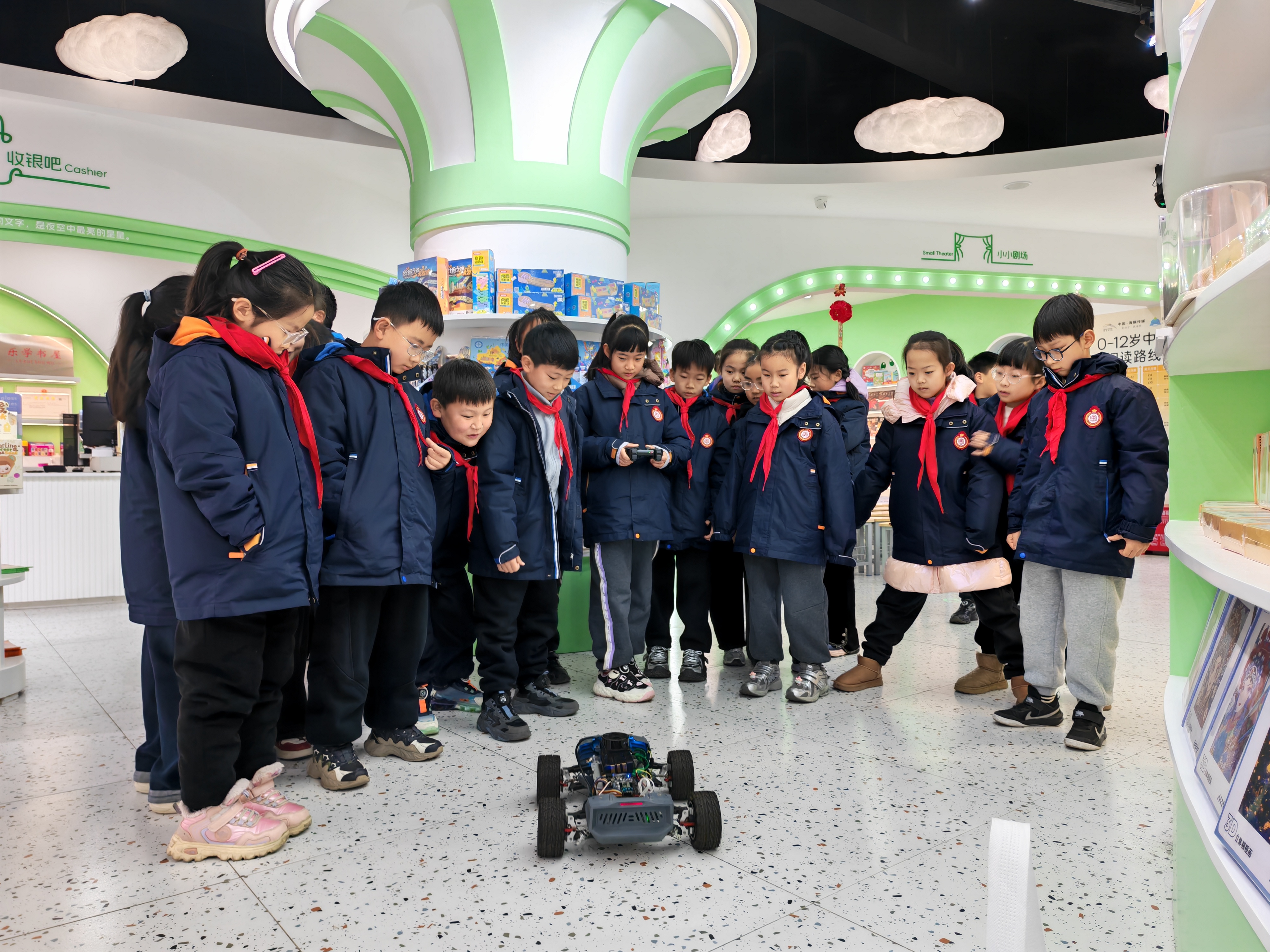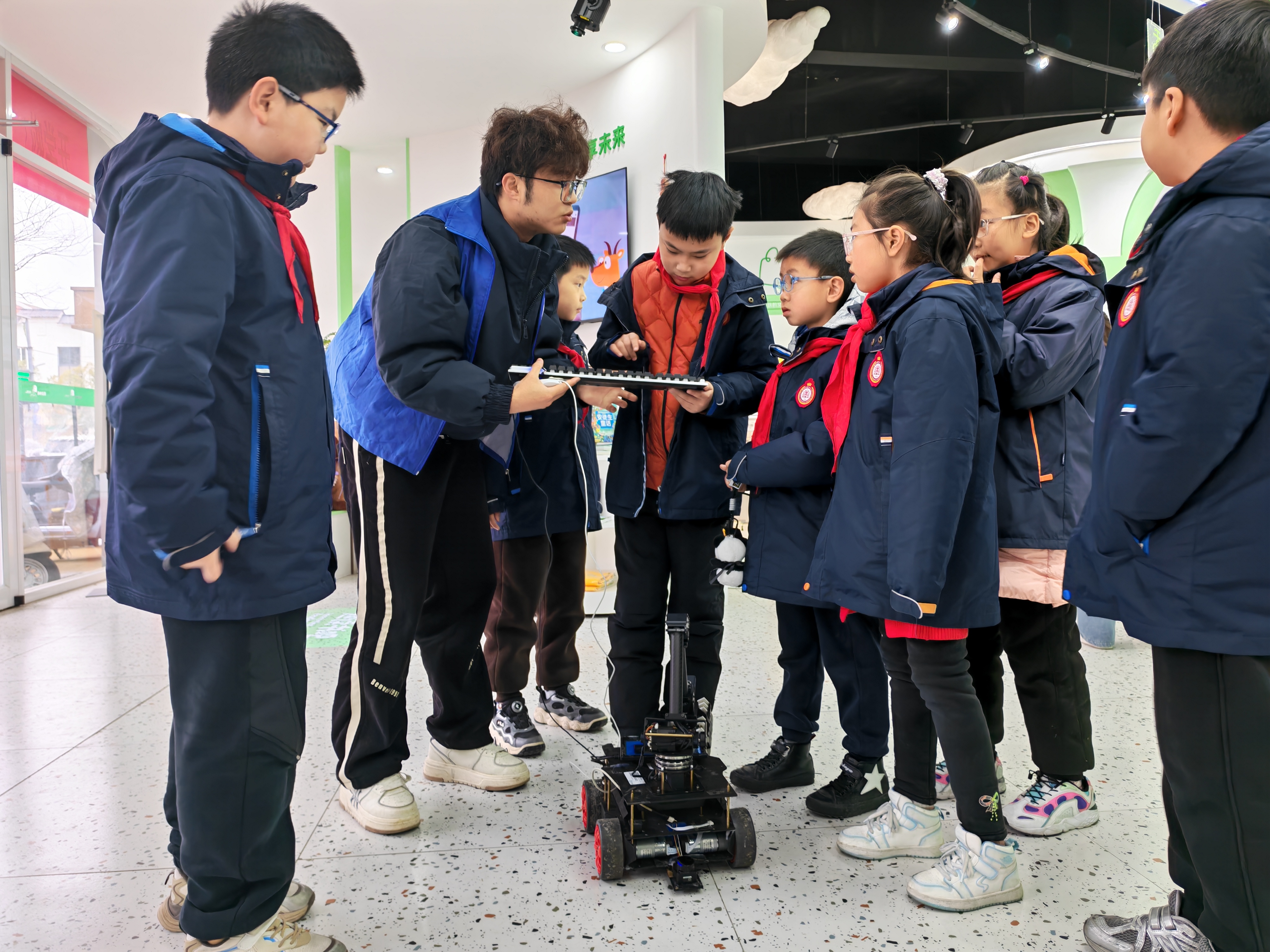 在分组互动环节,志愿者们手把手指导孩子们操控智能小车完成简易任务。孩子们在动手实践中直观感受人工智能的魅力,不时传来“小车动啦!”“太神奇了!”的欢呼声。一名参与体验的小员工兴奋地说:“原来小车能自己‘看路’,我长大也要设计这样的智能车!”